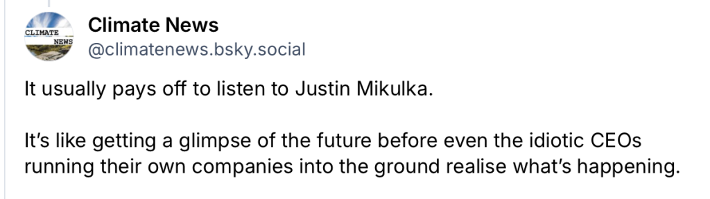 And, Justin Mikulka in “Great News for Clean Power and Storage” at The Daily Kos can probably relate as much as anybody and perhaps understands more than most. He writes: “There is a lot of great news in the clean energy space. We have the tools and technologies we need to transition to clean energy and eliminate carbon dioxide and methane emissions. That said, it isn’t enough yet. Emissions are still rising, including the potent greenhouse gas methane, and climate impacts are getting impossible to ignore. We need to get our politicians to do a lot more, a lot faster.”